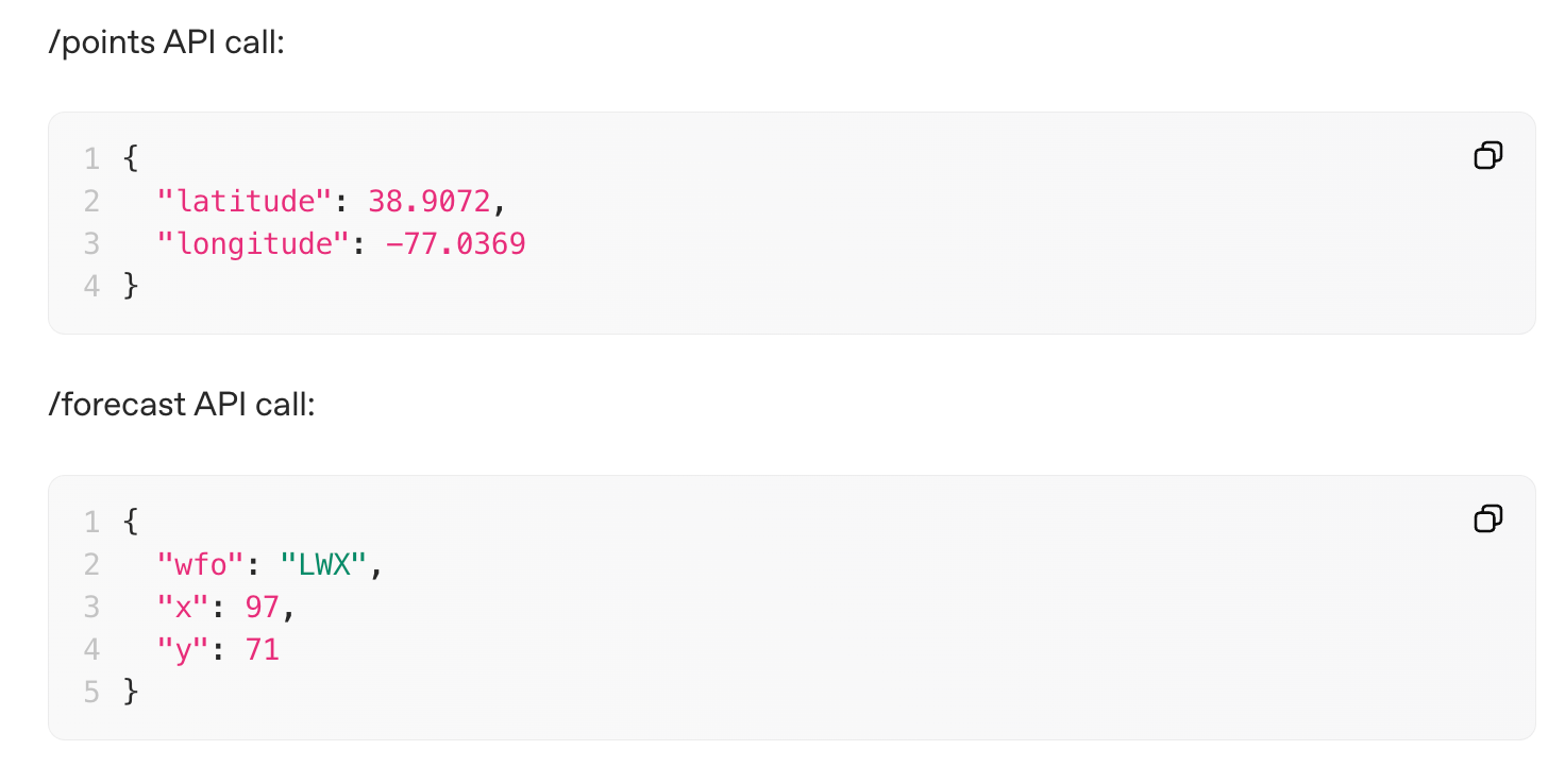 GPT Actions는 API 호출에 필요한 두 가지 입력값을 생성합니다. 예를 들어, /points API 호출 시에는 위도와 경도 정보가, /forecast API 호출 시에는 예보 사무소, x, y 좌표가 JSON 형식으로 전달됩니다.