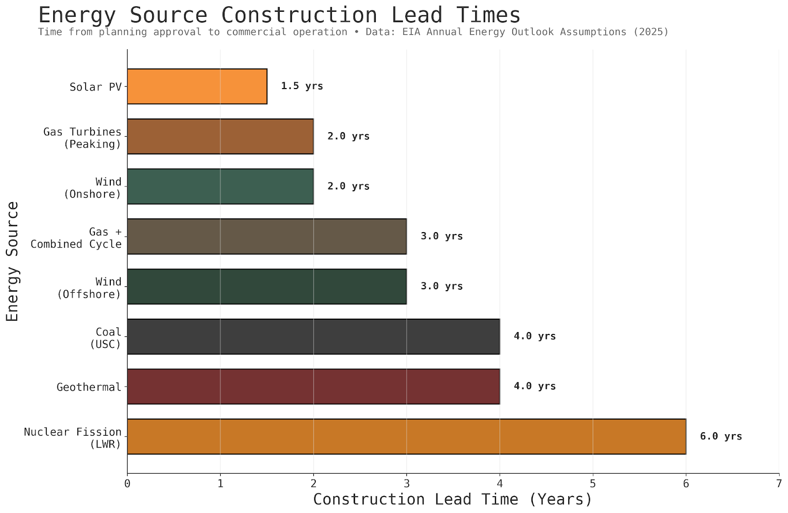 미국 정부가 2026년 전력 추가 생산을 본격화하여도 최소 2년 이상의 ‘전력 구축 기간’은 피할 수 없습니다. 아래 그림에서 확인할 수 있는 것처럼 에너지 인프라는 수년 단위의 리드 타임(lead time)을 필요로 합니다. 2년 이상 소요되는 리드 타임이 AI 인프라 병목을 물리적으로 구조화합니다. 이 병목은 설비 투자 금액을 늘린다고 해서 해결되는 문제가 아닙니다. 다시 말해 돈으로 해결할 수 없으며, 최소 2년이라는 물리적 시간이 절대적으로 요구됩니다.