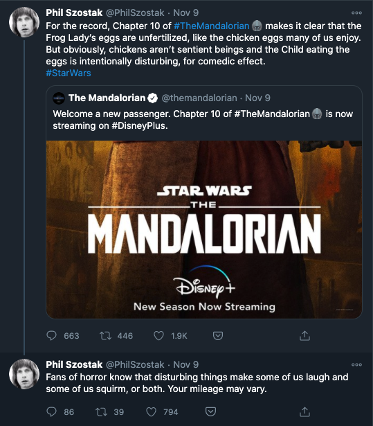 “내용에서 그 알들이 수정란이 아님을 분명하게 밝혔다. 우리가 먹는 계란과 다를 바 없다. 물론 닭은 지능을 가진 존재는 아니다. 그런데 아기(베이비 요다)가 알을 먹는 건 일부러 소름끼치게 만든 거다. 코믹한 효과를 내기 위함이다.”
