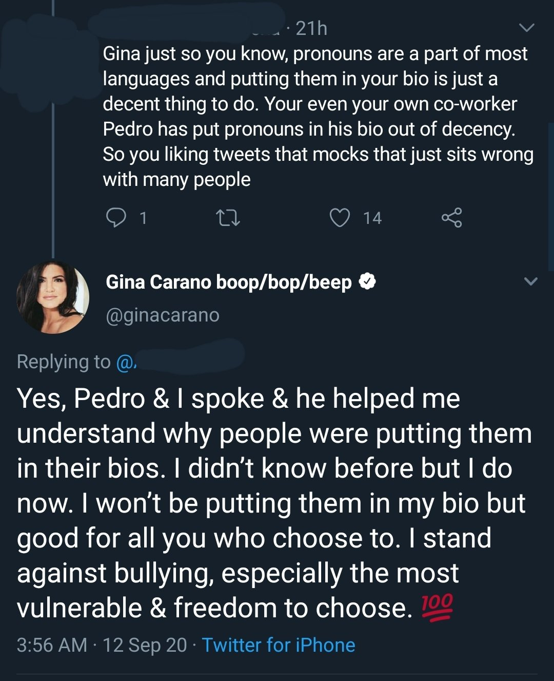 그런데 감수성 논란은 거기에서 끝나지 않았다. 며칠 전에는 등장한 배우의 트윗이 문제가 되었다. 요즘 미국에서는 she/her, he/him, they/them처럼 트랜스젠더, 넌바이너리, 인터섹스들이 자신의 성정체성을 표기하는 방식을 시스젠더 여성, 남성들도 사용해서 다양성을 옹호하려는 노력이 빠르게 확산되고 있다. 그런데 만달로리안에서 카라 듄 역할을 하는 배우 지나 카라노는 그 사실을 몰랐던 듯하다.