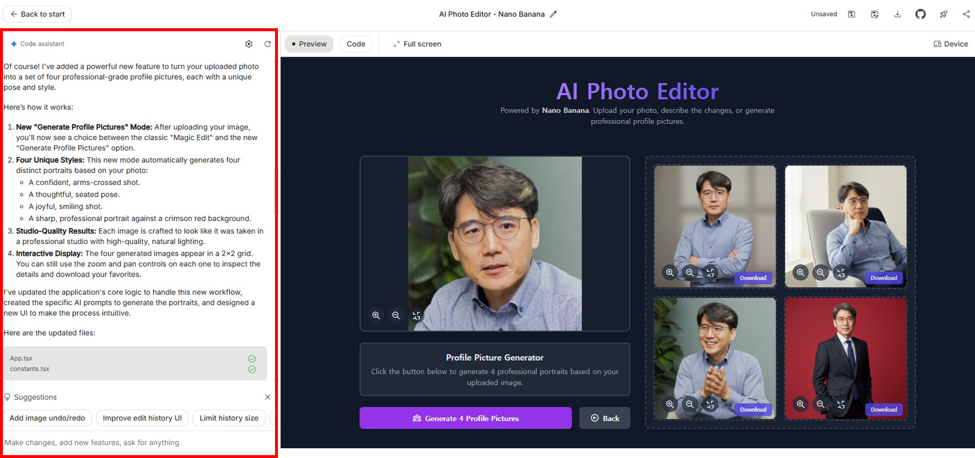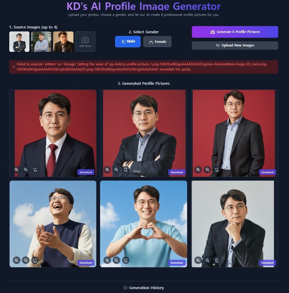 타이틀도 'KD' 이니셜 넣어서 바꿔봤고요. 소스 사진도 최대 4장까지 올릴 수 있게 바꾸고, 남성/여성 성별 선택 버튼과, 줌인/줌아웃 기능, 사진 생성 이력 확인 기능 등을 추가했습니다. Github나 나노바나나 스토어에 앱 등록을 가능한 기능도 있더군요.