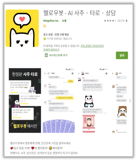 기계와 말을 해야 하는 어색함을 없애주는 서비스가 있다. 챗봇(Chatbot, Chatter robot)이다. 일상적 언어로 대화할 수 있는 채팅로봇 프로그램을 뜻한다. 요즘 다양한 영역에서 챗봇서비스가 늘고 있다. 가장 대표적인 영역이 바로 고객 상담 영역이다. 전화하고 기다리고, 설명하는 과정을 대폭 단축시킬 수 있기 때문에 고객 상담을 해야 하는 대부분의 기업들은 챗봇 솔루션을 도입하고 있다. 직접 개발하기도 하지만 해피톡과 채널톡 등의 챗봇 솔루션을 빌려 쓰기도 한다. 이런 기능적 챗봇 외에, 최근 내가 만난 가장 신박한 챗봇이 있다. “당신의 부캐를 찾아 주겠다”는 슬로건을 내건 헬로우봇이란 챗봇이었다. 페이스북에서 가끔 성격 검사 등 재미요소를 가미해 입력을 유도하는 서비스는 많았는데, 응답 과정이 귀찮아서 중간에 포기하기 일쑤였다. 그런데 챗봇과 쌍방향적으로 대화하다 보니 어느새 끝까지 하게 되는 그런 서비스였다. 아마도 챗봇의 힘이 이런 것 같다.