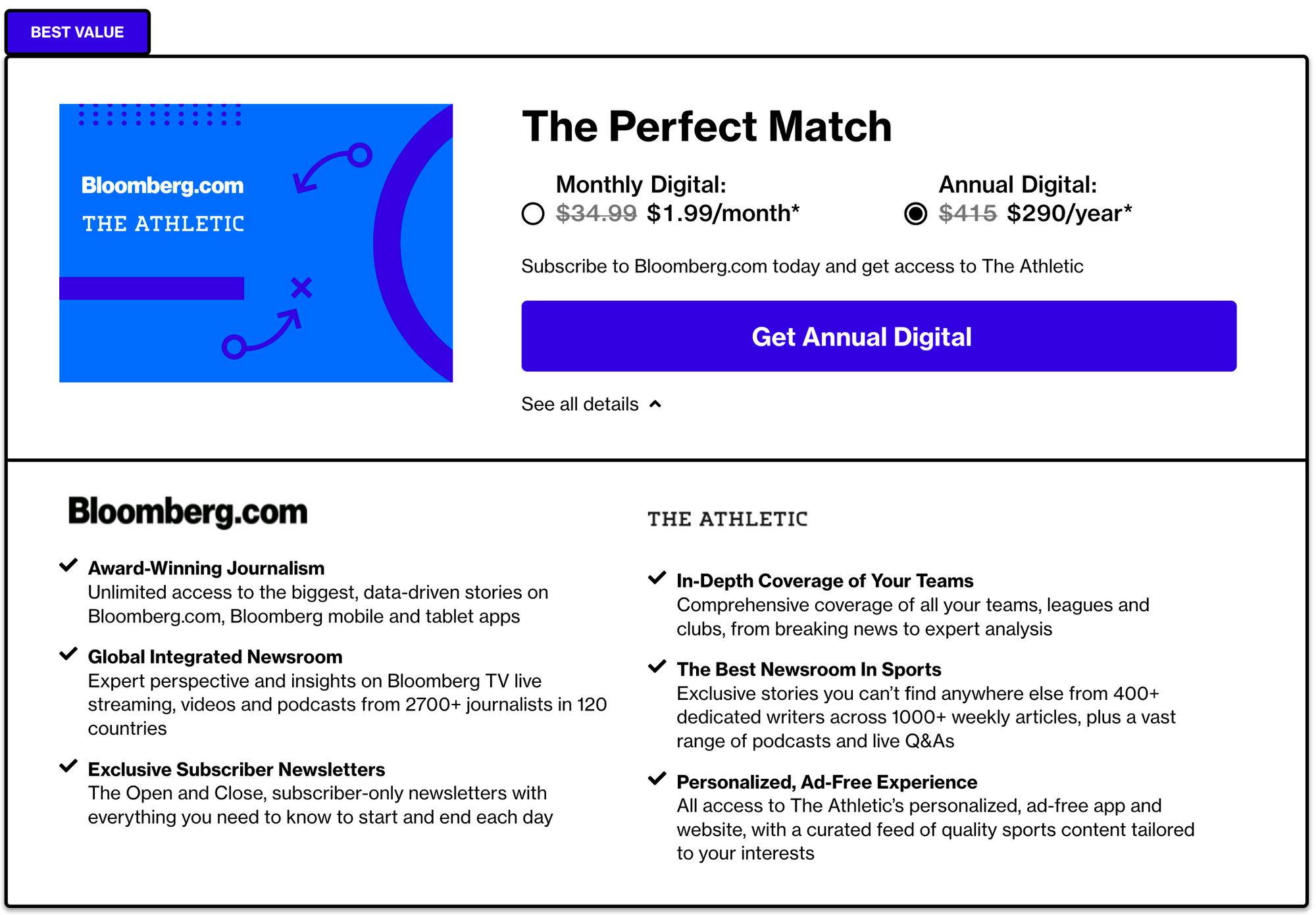 Axios에서도 보도를 했다시피, 블룸버그와 디애슬래틱이 디지털 구독 번들 상품을 내놨습니다. 블룸버그는 2018년부터, 디애슬래틱은 2016년 창간 때부터 구독모델을 운영해왔습니다. 한쪽은 비즈니스 미디어, 다른 한쪽은 스포츠 전문 미디어로 서로 카테고리도 겹치지 않습니다.