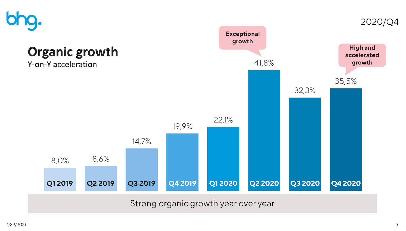 BHG의 매출 성장세를 살펴보면, 2020년 총매출은 약 8억 4,500만 유로로 2018년 대비 2배 가까이 성장했습니다. 특히 2020년 코로나 팬데믹이 매출 증가에 크게 기여했습니다.