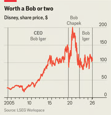 디즈니의 발전을 이끌었던 밥 아이거도 주가 반전을 이끌어내진 못했습니다. [출처=LSEG Workspace, The Economist]