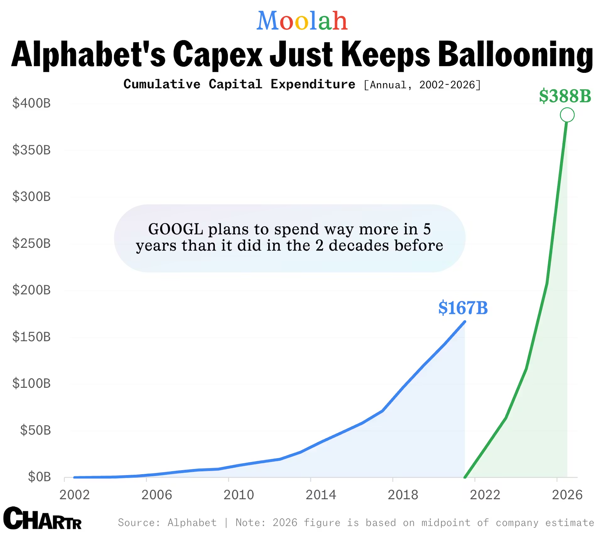 알파벳이 놀라운 4분기 실적 발표와 함께 FY2026 설비투자(Capex)를 1750억~1850억달러로 제시하며 시장을 두 번 놀래켰습니다. 지난해 914억달러의 두 배 수준이자, 시장 예상치보다도 약 700억달러 많은 금액이었기 때문입니다.