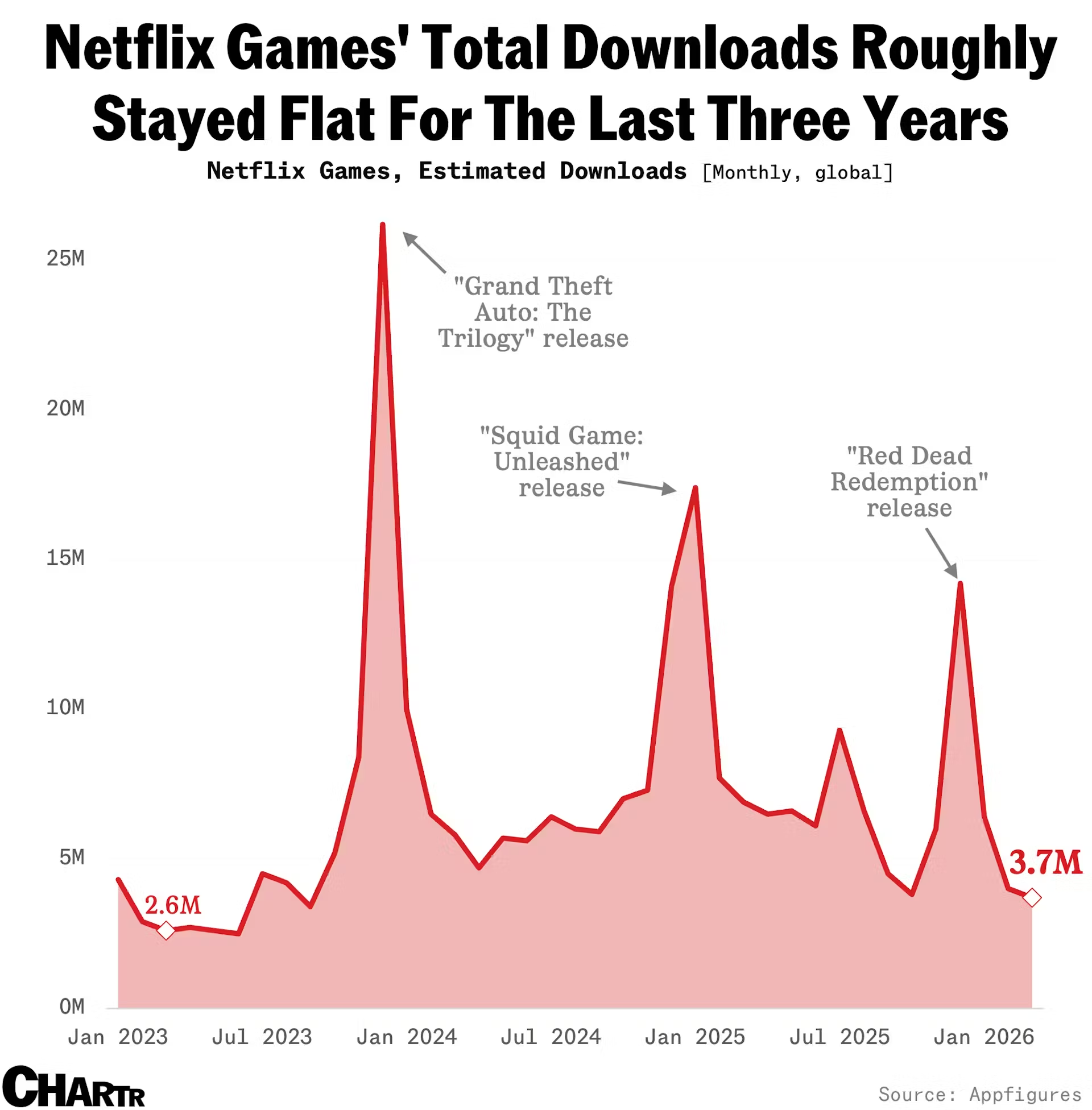 - 실제 성과를 보면 방향 전환의 이유가 분명해집니다. 넷플릭스는 게임 사업에 약 20억달러를 투자했지만, 월간 다운로드는 대부분 200만~400만 건 수준에 머물렀고 일부 히트작도 반짝하는 정도였습니다.