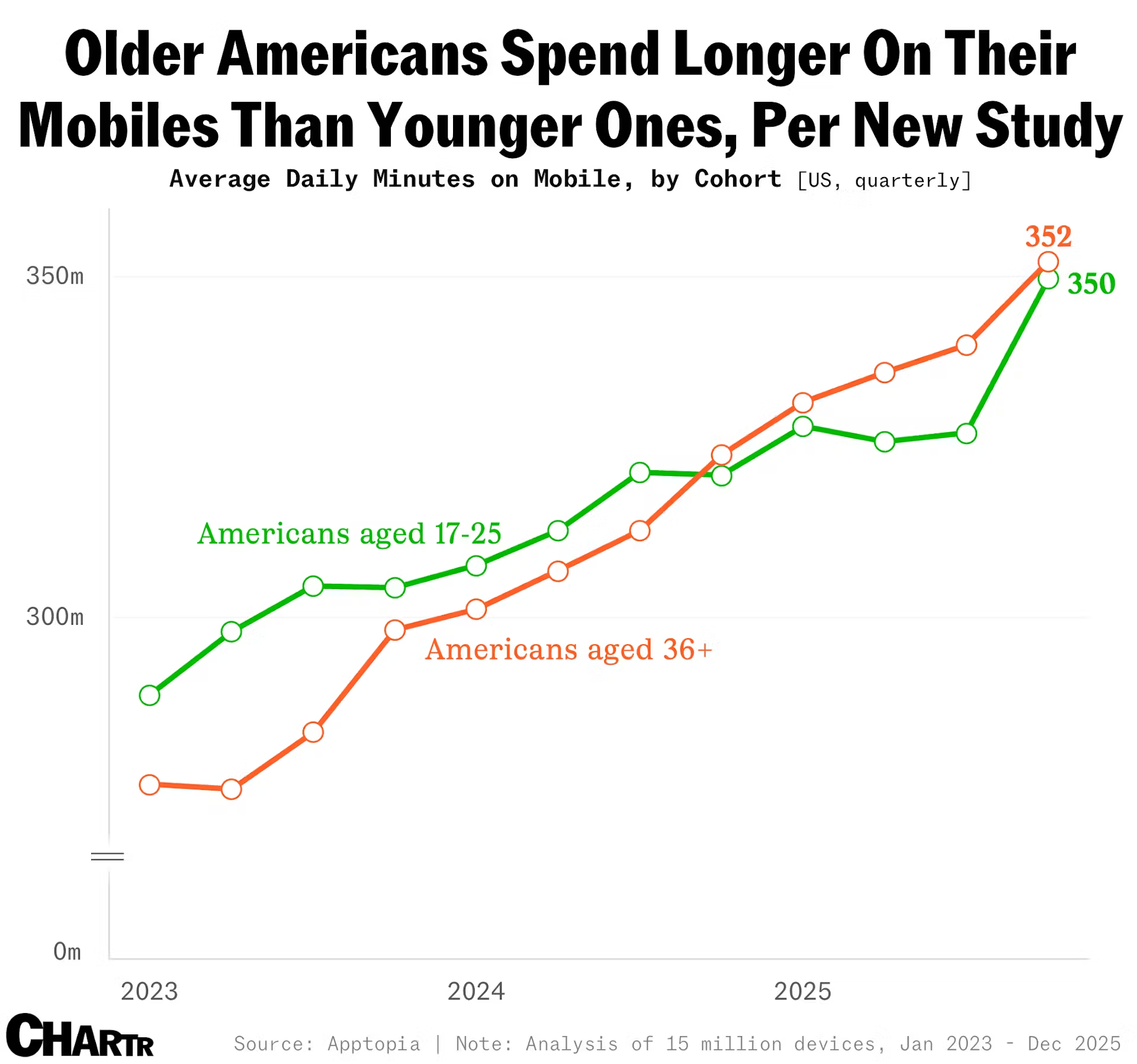- 하지만 최근 데이터는 이런 통념에 작은 균열을 냅니다. 모바일 앱 분석업체 앱토피아(Apptopia)에 따르면, 미국의 17~25세 청년층이 오히려 36세 이상 성인보다 스마트폰 사용 시간이 더 적은 것으로 나타났습니다.
