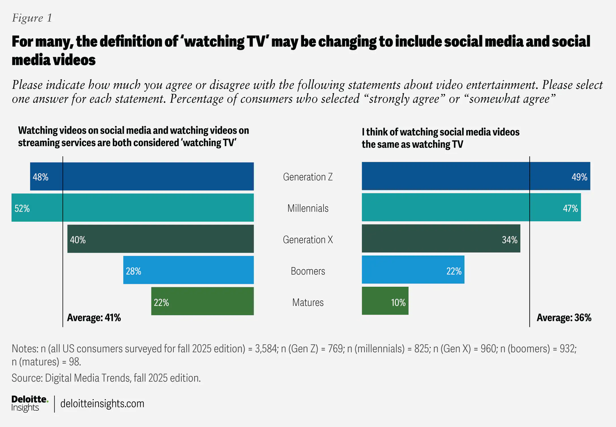 미국에서 TV 시청의 개념이 근본적으로 바뀌고 있습니다. 딜로이트가 2025년 가을 발표한 디지털 미디어 트렌드 조사에 따르면, 응답자의 41%가 소셜 미디어 영상과 스트리밍 서비스를 둘 다 TV 시청의 일부로 인식하고 있습니다. 이 현상은 Z세대부터 베이비부머까지 전 세대에 걸쳐 나타나고 있습니다.