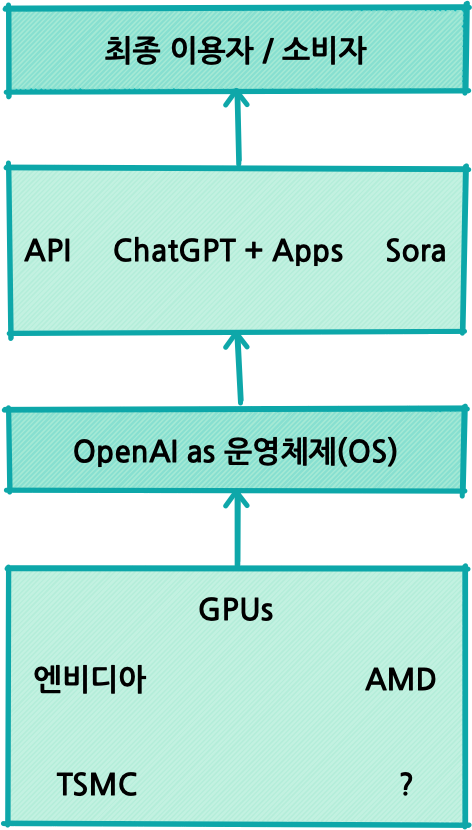 대규모 최종 이용자를 확보한 OpenAI는 아래 그림과 같은 구조의 AI 시장 청사진을 제시하고 있습니다.