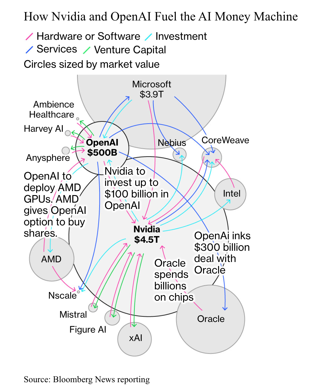 AI 거품 주장의 첫 번째 근거는 이른바 순환 거래(circular deals)입니다. 쉽게 표현하면 왼쪽 주머니의 돈을 오른쪽 주머니로 옮겼을 뿐 새로운 가치 창출은 없다는 주장입니다. 엔비디아는 AI 칩 분야에서 80%에 가까운 수익률을 보이며 막대한 돈을 벌어들이고 있습니다. 엔비디아는 이렇게 벌어드린 돈을 OpenAI를 비롯 AI 칩이 필요한 기업에 다시 투자하고 있기 때문입니다. 아래 블룸버그 시각화가 이를 정확하게 보여줍니다.