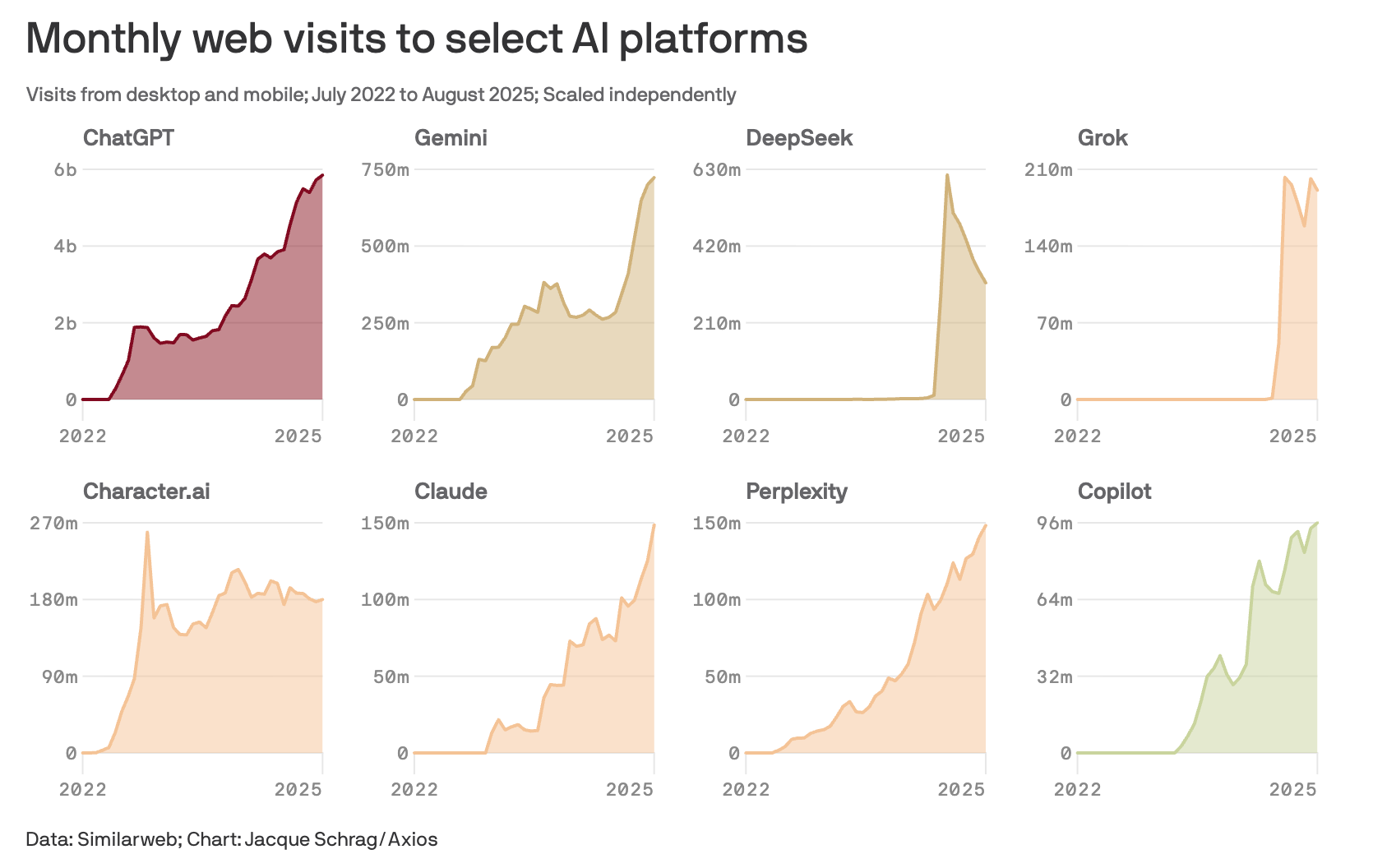 플랫폼은 최소 두 집단(예: 최종 소비자–개발자)을 연결하는 양면시장(two-sided markets) 구조이며, 한쪽의 규모가 다른 쪽의 참여 유인을 강화합니다. 오랜 기간 양면시장 이론에서는 예를 들어 소비자 그룹 구성이 먼저냐 개발자 그룹 형성이 먼저냐는 닭과 달걀 논쟁(chicken and egg problem)이 존재했습니다. 개발자 그룹이 풍부해야 소비자의 선택지가 넓어지고, 소비자 규모가 커야 개발자의 경제적 참여 동기가 커지는 관계에서, 플랫폼이 성공하기 위해서는 이 중 어느 그룹이 먼저 형성되어야 하는가의 문제입니다. 그러나 지난 디지털 경제 역사에서 실무적으로 ‘소비자 측 우선’ 전략이 성공으로 검증돼 왔다는 해석이 우세합니다. 먼저 소비자 또는 최종 이용자를 확보해야 개발자를 끌어들여 플랫폼을 강화할 수 있기 때문입니다. 대규모 소비자를 확보한 서비스가 플랫폼으로 진화할 가능성을 높습니다. 최종 이용자의 규모가 절대적으로 중요합니다. 이 관점에서 OpenAI의 ChatGPT가 압도적인 1위를 기록하고 있습니다. 아래 Axios 인용 보도한 시각 데이터를 보시죠.