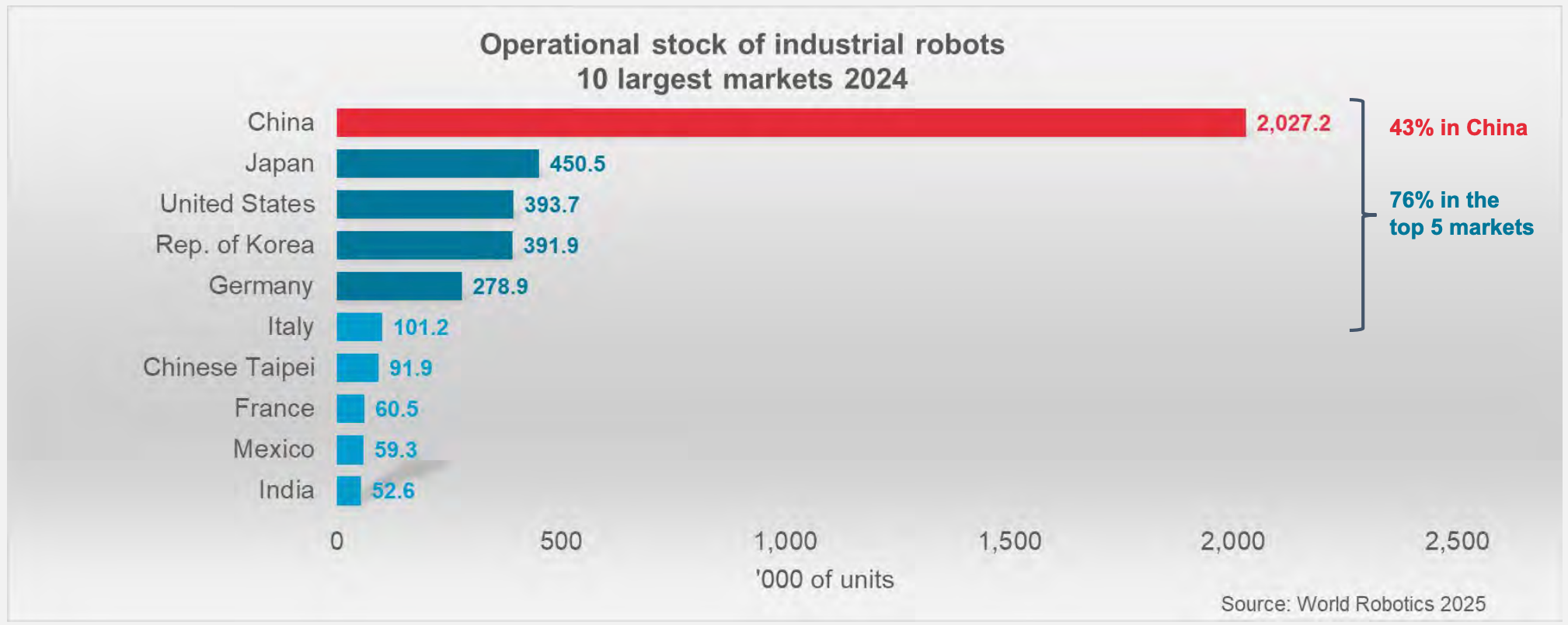한국도 로봇과 자동화 기술은 세계 상위권입니다. 아래 표는 국제로봇연맹(IFR)이 2025년 9월에 발표한 2024년 국가별 산업 로봇 신규 설치 규모 자료입니다. 한국 로봇 설치 수는 세계 4위로 독일을 크게 앞서고 있습니다. 그러나 1위 중국의 규모를 직접 보십시요.