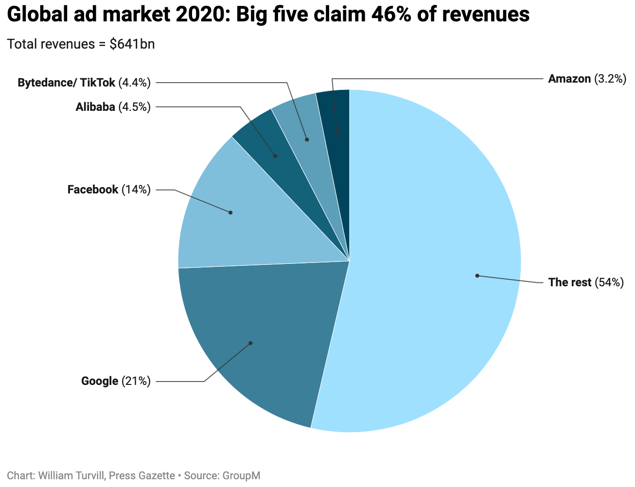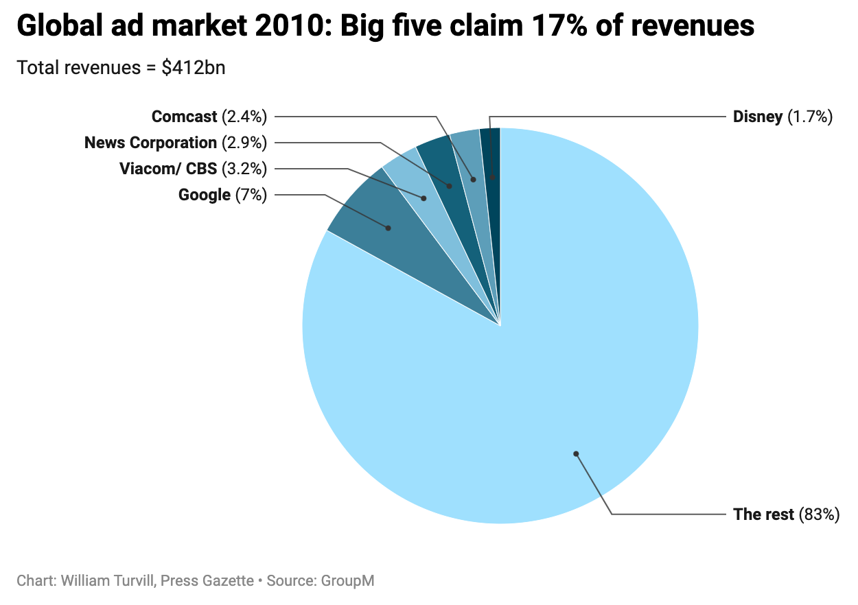 먼저 아래의 그림을 보시기 바랍니다. 2010년과 2020년 세계 광고시장 점유율 비교입니다. 놀라운 변화가 발생했습니다. 출처는 PressGazette입니다.