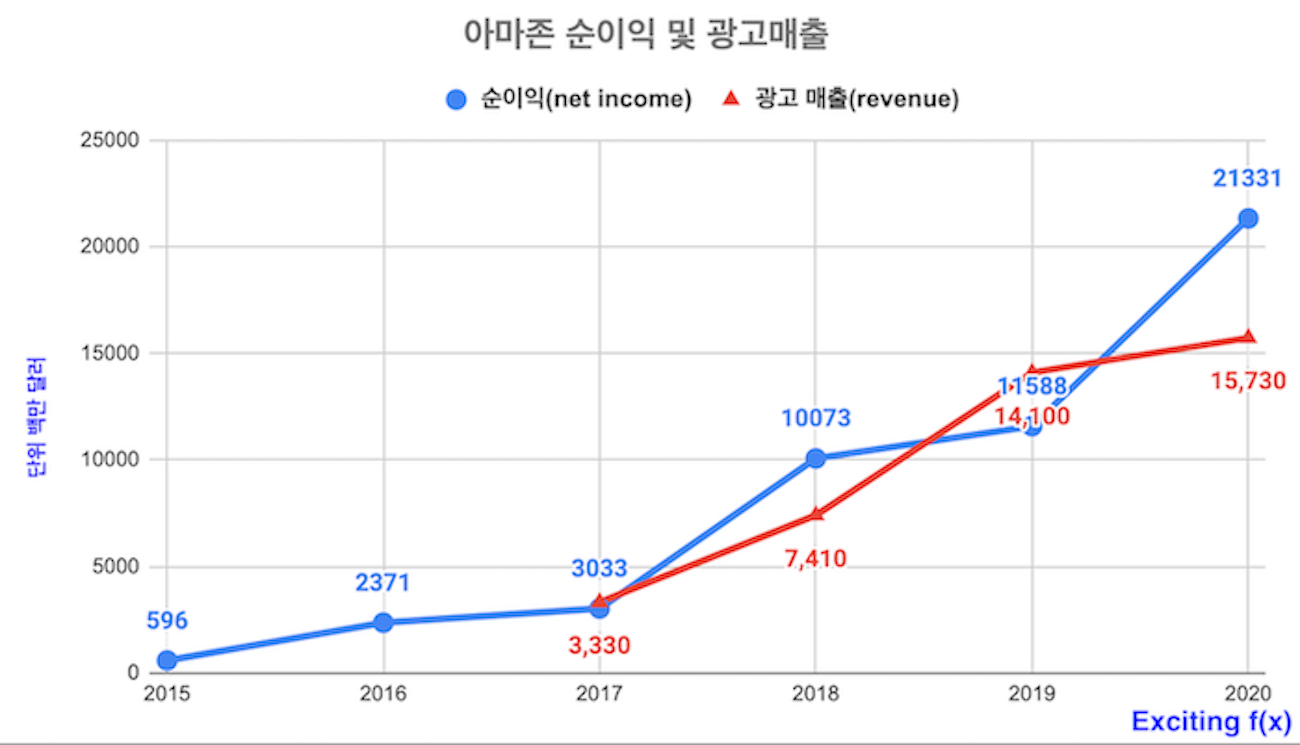 아마존의 순이익(net income)이 적자(-)에서 흑자(+)로 전환된 해는 2015년입니다. 그렇다면 1997년 상장한 아마존은 기나긴 적자의 시간을 어떻게 견딜 수 있었을까요? 많은 이들은, 아마존은 AWS에서 벌어서 본업이라고 할 수 있는 아마존 커머스의 손실을 상쇄할 수 있었다고 주장합니다. 저도 동의하는 의견입니다. 아마존은 이윤율이 서로 다른 다양한 비즈니스의 묶음(bundle)입니다. 때문에 아마존 전체의 순이익(net income) 흐름에서 개별 아마존 비즈니스의 전략적 가치를 판단하는 일은 불가능에 가깝습니다. 아마존에게 있어 AWS만이 이윤율이 높은 비즈니스가 아닙니다. 바로 광고 비즈니스가 아마존의 이윤율을 크게 높여주는 핵심 기둥이 되고 있습니다. 먼저 아래 그래프를 보시지요. 아마존의 순이익(net income: 파란선)과 아마존의 광고 비즈니스 매출(revenue: 빨간선)을 비교하고 있습니다. 자료출처는 순이익의 경우 위키피디아, 광고 매출의 경우 eMarketer입니다.