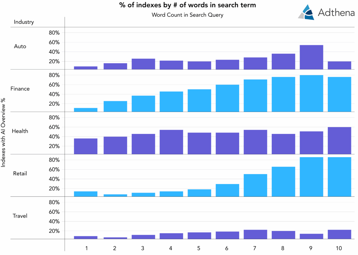산업별 심층 분석 결과, 검색어 길이가 길수록 AI 개요가 노출될 확률이 높다는 기존의 경향은 모든 산업에서 일관되게 나타났습니다. 그러나 이번 분석에서는 그 영향력의 규모와 강도가 더욱 커졌습니다. 특히 금융 및 소매 산업에서 짧고 검색량이 많은 검색어에 대한 AI 개요 노출이 의미 있게 증가했습니다.