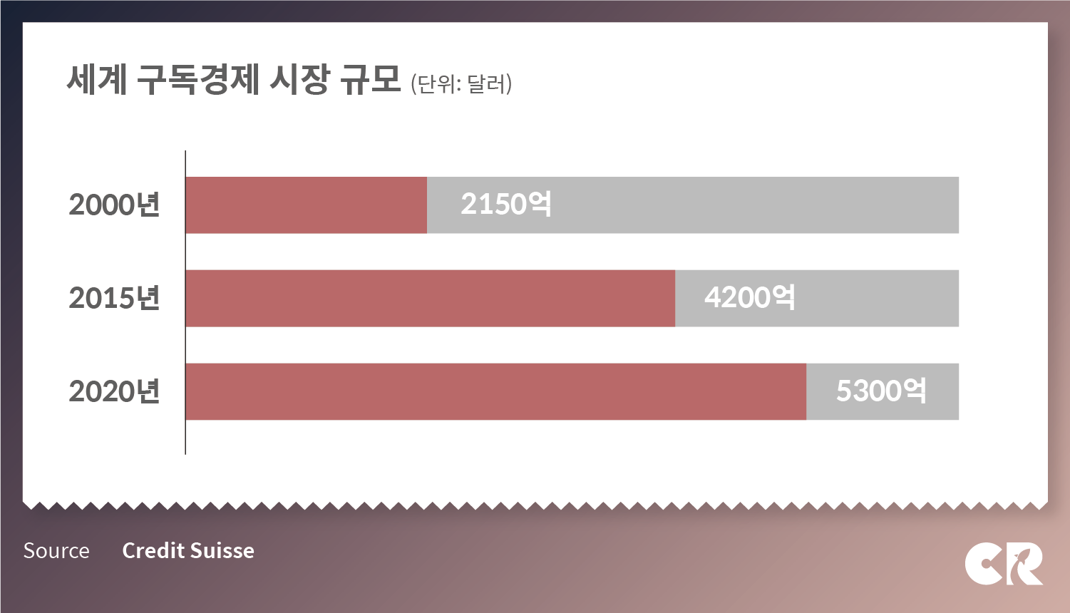 구독경제 시장은 매년 급격한 성장세를 보이고 있다. ‘크레디트 스위스’에 따르면 2016년 4,200억 달러(약 516조원)였던 구독경제 시장은 올해 5,300억달러(약 651조원)에 이를 것으로 전망했다. 구독경제라는 말을 처음 사용한 미국의 결제 시스템 소프트웨어 회사 ‘Zuora’(주오라)는 경험 중심의 구독경제에 초점을 맞춰 “제품을 소유하는 것은 이제 과거의 방식”이라고 단언했다.