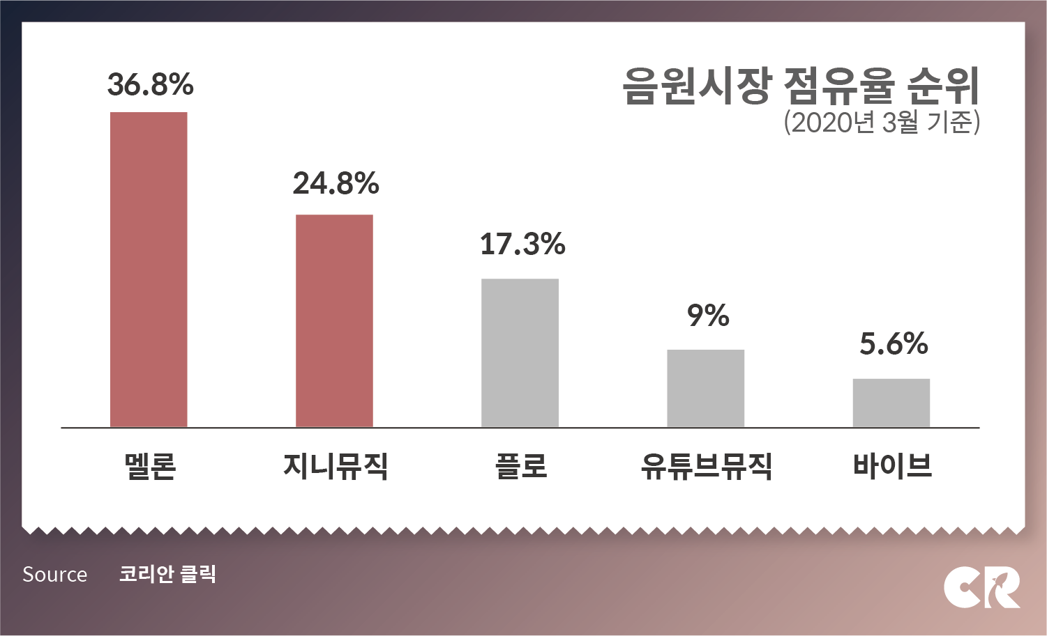 2020년대 음악시장의 가장 중요한 트렌드로 많은 이들이 주목하는 스트리밍 서비스의 한국시장 규모는 3.7%를 기록했다. 1위를 차지한 미국(41.4%)을 필두로 영국(7.7%), 독일 (5.4%), 중국(5.4%), 일본(4.0%), 프랑스(4.0%) 등이 선두그룹인데 그 바로 뒤에 자리한 7위가 한국이다.