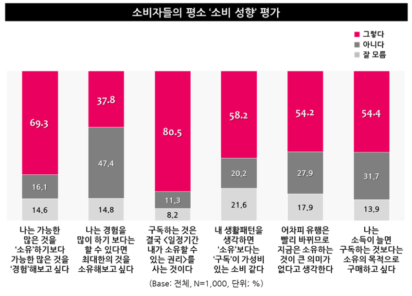 조금 더 상세히 살펴보자. 먼저 평소 소비자들의 소비성향이다. 10명 중 7명(69.3%)은 가능한 많은 것을 소유하기보다는 가능한 많은 것을 ‘경험’해 보고싶다는 바람을 가지고 있다.