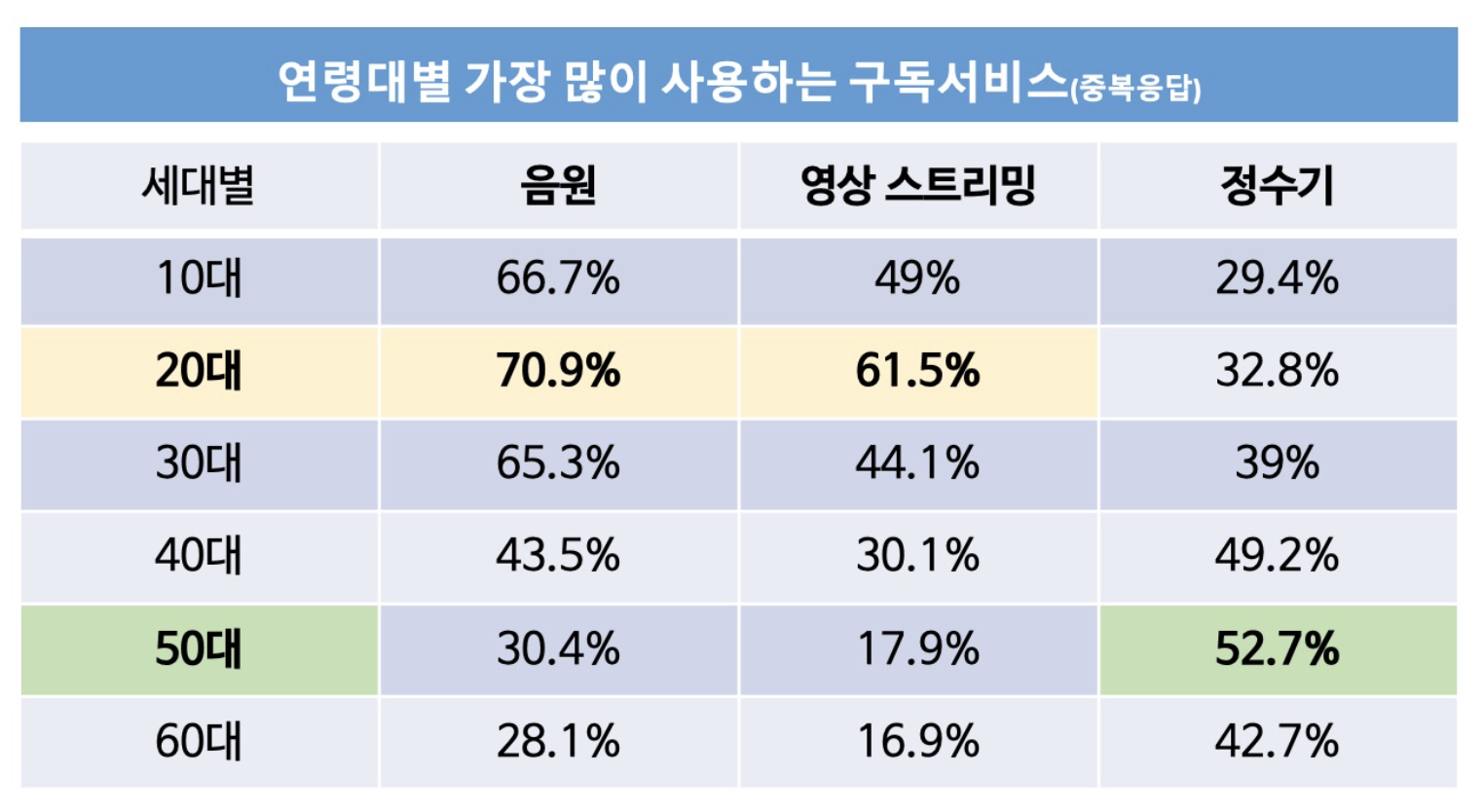 저연령층일수록 음원 서비스와 영상 스트리밍 서비스로 대표되는 미디어 콘텐츠의 구독 경험이 많은 반면 고연령층에서는 정수기와 신문을 구독한 경험이 많은 특징이 뚜렷했다.