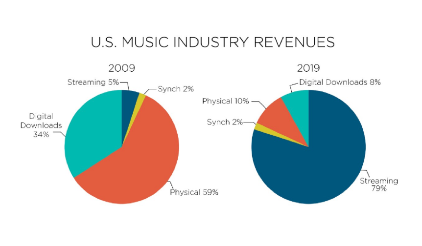 불과 몇 년 전만 해도 음악 산업은 위기였다. 싱글 다운로드, 해적판 등으로 인해 CD앨범이 멸종되면서 음악 산업의 매출이 절반으로 줄어 들었다. 스트리밍 시장이 등장하면서 죽어가던 음악 시장을 살렸다. 오늘날 음악 산업은 스트리밍이 주도하고 있다. 레코드나 CD같은 물리적인 제품을 사는 사람들이 의존했던 음악 사업은 스포티파이(Spotify)같은 스트리밍 서비스를 통해 음악을 듣는 소비자들에게로 옮겨 갔다.