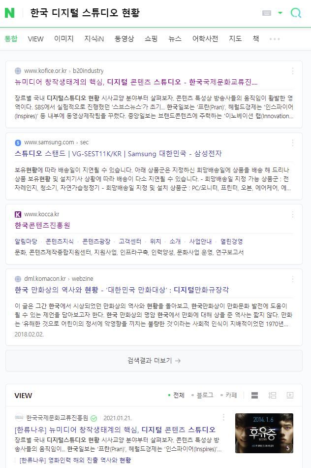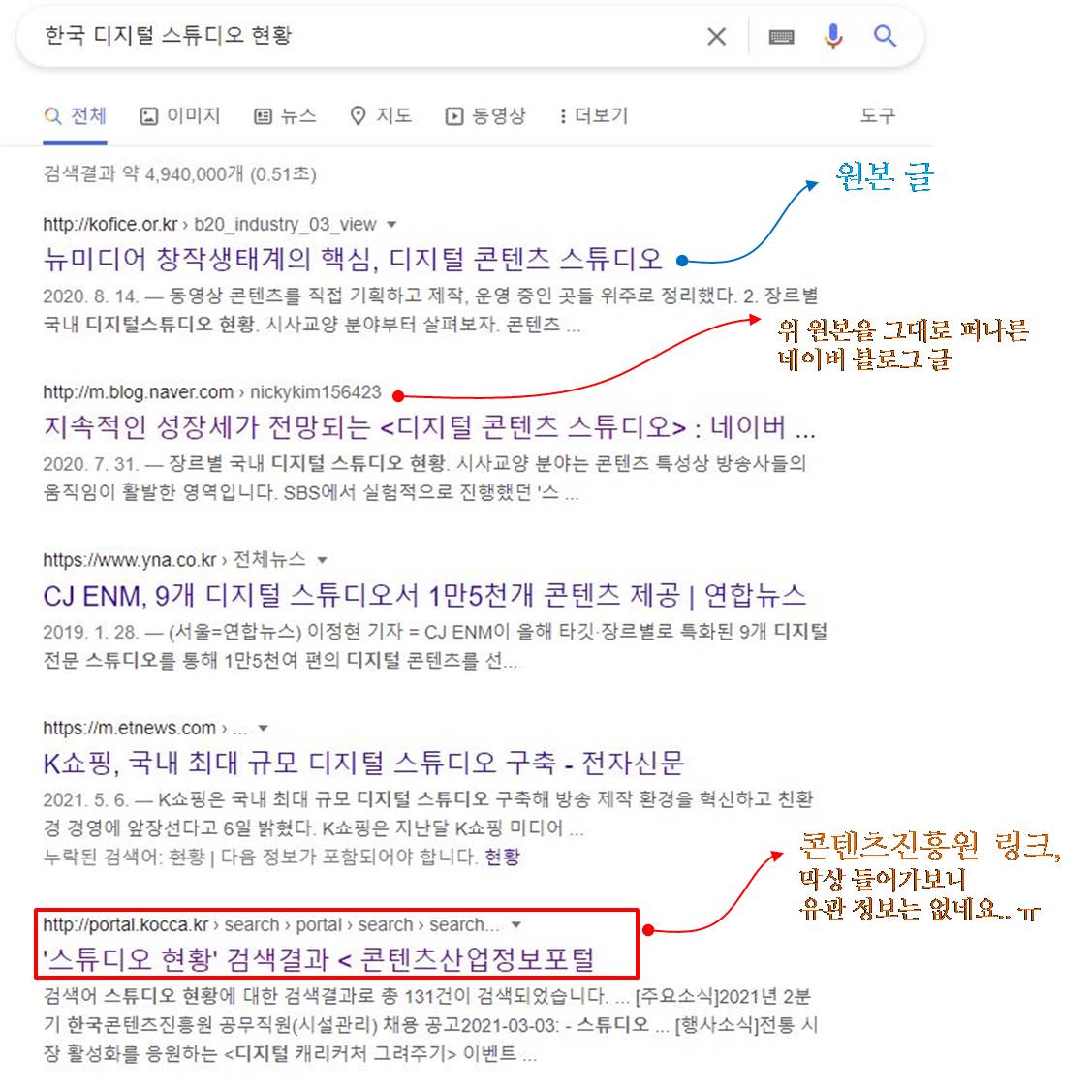 네. 제목처럼, 구글과 네이버에서 '디지털 스튜디오 현황'을 검색해 봤어요.(검색결과는 하단 이미지 참조) 두 검색엔진 모두 [뉴미디어 창작생태계의 핵심, 디지털 콘텐츠 스튜디오]라는 제목의 글 링크를 첫 결과값으로 내놓았더군요. 반갑게 클릭했는데... 어? 많이 본 이미지 같다 싶더니.. 작년에 제가 외부 잡지에 기고한 글이더군요.