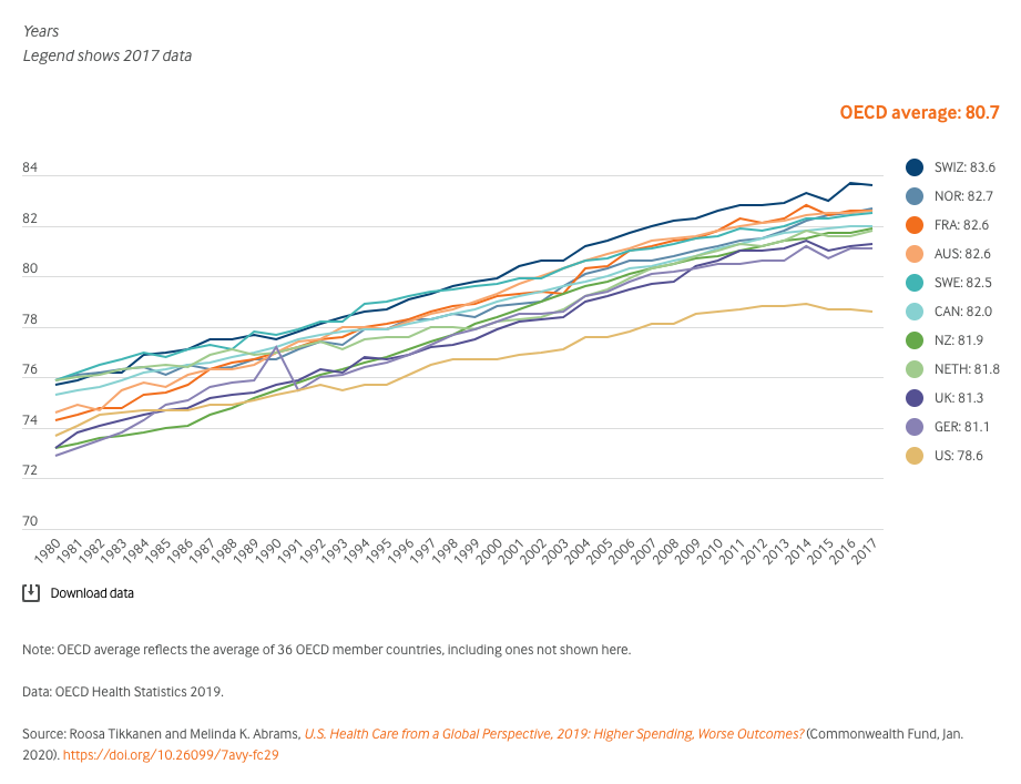 아래 <표1>을 보면 바로 알 수 있듯이 미국은 OECD 국가들 중에서 가장 많은 의료비를 지출하는 나라다. GDP의 비중으로 선진국 평균의 두 배에 해당하는 돈을 쏟아붓는 나라다. 그런데 그렇게 많은 비용을 지불하고도 국민들의 평균 기대수명은 80세 이하로 OECD의 최하위 수준이다. <표2>