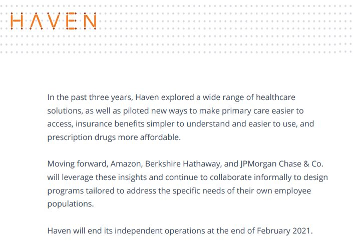 헤이븐 헬스케어는 상주 직원이 57명으로 큰 조직도 아니고 수익을 내기위한 기업도 아니었다 (비영리단체로 분류된다). 이렇게 작은 조직이 관심을 끌었던 이유는 헤이븐이 버크셔 해서웨이의 워렌 버핏, 아마존의 제프 베이조스, 그리고 JP 모건의 제이미 다이먼(Jamie Dimon) 세 사람의 거물이 의기투합해서 만들어낸 단체이기 때문이다. 미국에서 산업의 미래를 내다보는 현인들로 유명한 세 사람의 CEO가 뭉쳤는데 별다른 결실을 맺지 못하고 문을 닫게 되었다는 것은 미국의 의료문제가 얼마나 풀기 어려운 난제인지를 잘 보여준다.