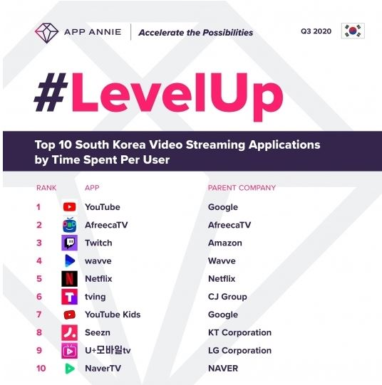 그런데 아래 표를 보자. 2020년 11월에 발표 자료다. 모바일 데이터 분석 플랫폼 앱애니에 따르면, 상위 10개 앱의 사용자당 평균 이용 시간 순위 중 웨이브가 넷플릭스보다 1단계 높은 4위를 차지했다. 이 자료를 토대로, 국내 토종 OTT들의 영향력이 낮지 않음을 반증하는 기사가 쏟아졌다.