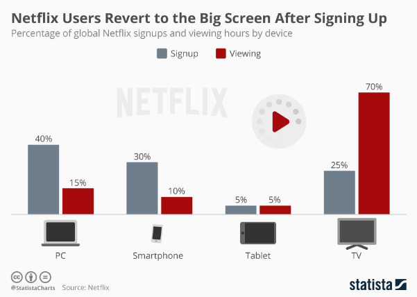 넷플릭스를 TV 디바이스로 시청하는 비중에 대한 국내 데이터는 존재하지 않지만 글로벌 수준으로 보면 이미 70%를 넘었다. 추정컨대 국내 시장도 60%를 넘었다는 것이 필자의 판단이다. 그 판단은 아래와 같은 2가지 이유에 근거한다.