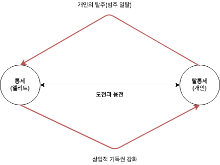잠시 위 그림을 보시겠어요? 제가 기술을 바라보는 관점입니다. 저는 이 과정을 ‘통제와 탈통제의 순환적 동학’이라고 부릅니다. 어떤 기술은 기본적으로 탈통제로부터 성장의 모멘텀을 얻지만, 이후 통제의 욕망 혹은 압력에 의해 서서히 성장세가 둔화되는 과정을 반복하게 된다는 개념입니다. 통제하려는 힘(구심력)과 통제를 벗어나려는 힘(원심력)이 도전과 응전처럼 반복된다는 의미로 이해하셔도 됩니다. 여기서 통제의 주체는 (기술)엘리트이고 탈통제의 주체는 개인입니다.