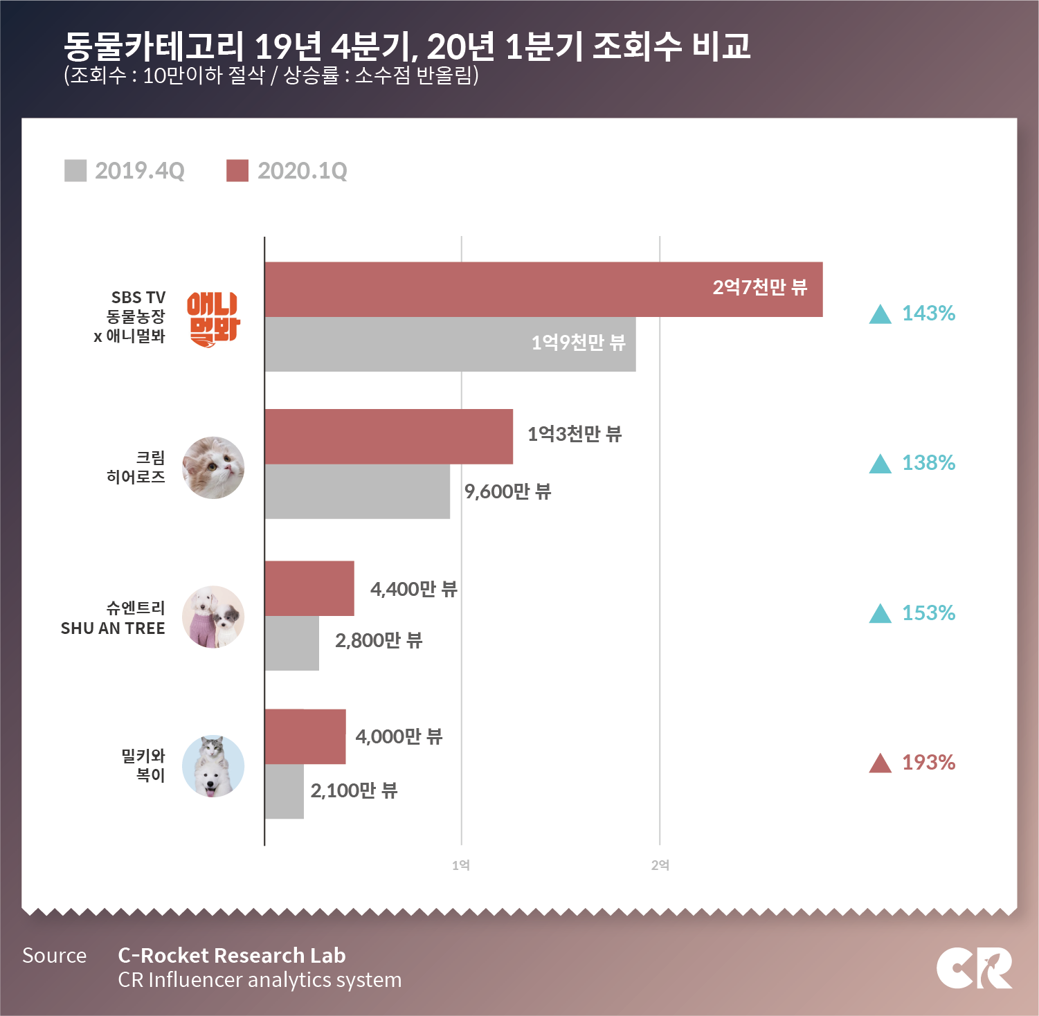 SBS TV 동물농장의 공식 SNS 채널 ‘애니멀봐’는 2017년 6월 론칭 후 4월 현재 구독자 수가 309만 명(20.5.17. 기준)에 이른다. 코로나 이전과 비교했을 때 구독자수는 60만명이 늘었고 조회수도 1.4배 증가했다. 동물 카테고리 중에서 가장 많은 구독자를 보유한 ‘크림히어로즈’ 역시 1.3배의 증가률을 보여주었다. 지난 3월, 크림히어로즈 채널 소유권 이전 논란이 일면서 구독자 감소폭은 상당했었음에도 결과적으로 조회수는 대폭 증가한 셈이다.
