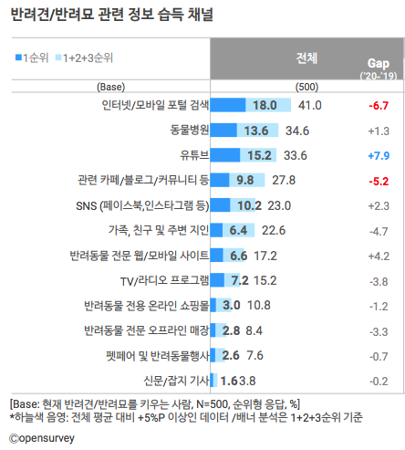 사람들이 반려견과 반려묘 관련 정보를 찾을 때 어떤 채널의 이용이 가장 많을까. 오픈서베이에 따르면 2019년 대비, ‘온라인 포털 검색’과 ‘카페/블로그’ 이용은 줄어든 반면 ‘유튜브’ 이용은 증가했다. 20대는 SNS 와 유튜브를 활용해 정보습득이 많은 반면 50대는 주변 지인과 전문 오프라인 매장을 통한 정보 습득이 많은 편이었다. 사람들이 반려동물을 키우지 않는 가장 큰 이유는 관리상 어려움 때문(35.8%)이 많았다(복수응답 허용). 반려견 양육 선호도는 전년 대비 11.9% 감소했고, 고양이는 전년 대비 9.2% 증가했다. 반려견 양육 선호도는 감소했지만 반려묘 양육 선호도는 높아졌다.