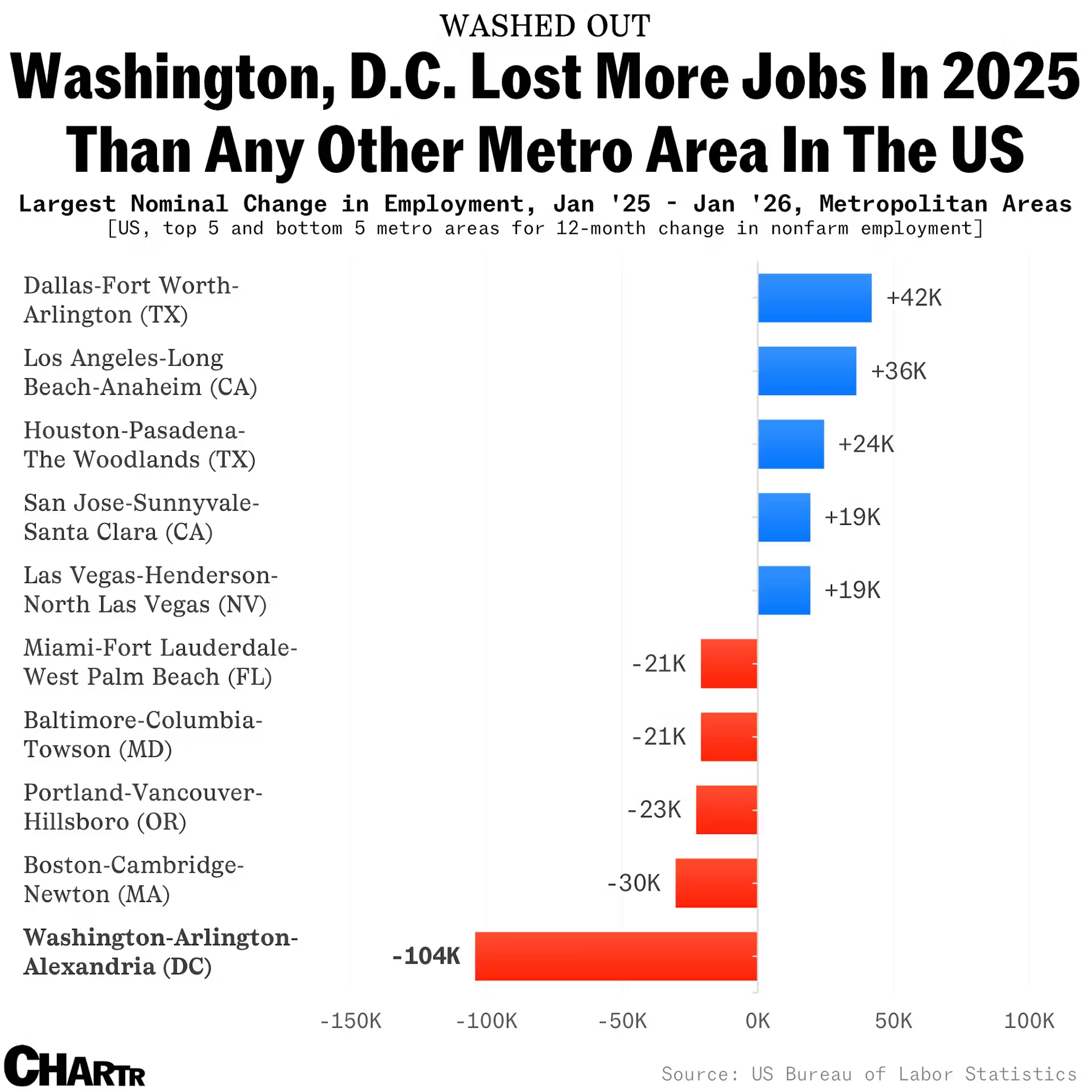 지난해 미국에서 가장 많은 일자리가 사라진 도시는 워싱턴DC였던 것으로 나타났습니다. 지난해 워싱턴에서는 지난해 약 10만4000개의 일자리가 사라지며, 두 번째로 감소폭이 컸던 보스턴의 3배를 넘는 수준을 보였습니다.