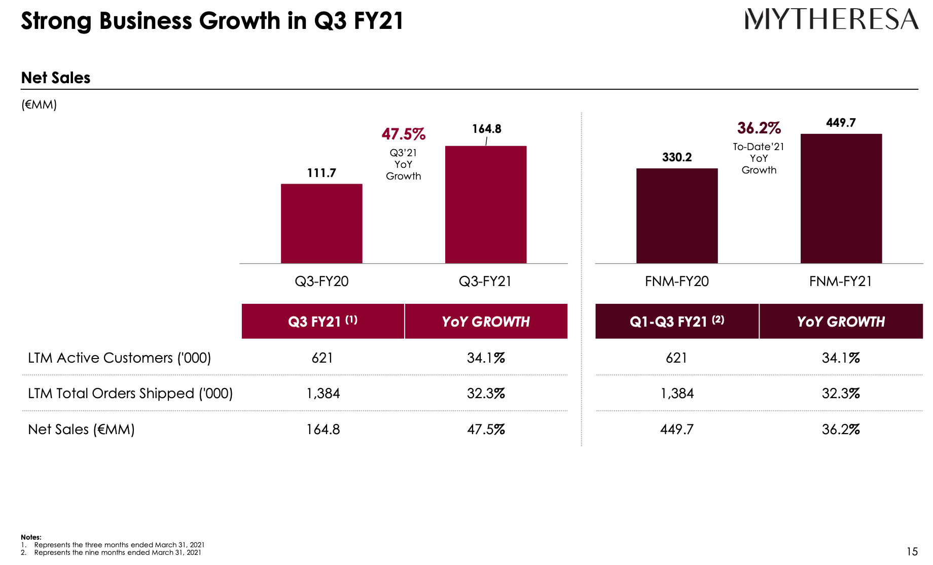 마이 테레사(MyTheresa)는 2006년 독일에서 설립되었고, 2021년 1년 뉴욕증시(NYSE)에 상장된 온라인 럭셔리 커머스 기업입니다. 경쟁기업은 파페치(Farfetch)입니다. 21년 1월 상장 당시 마이 테레사의 평가액은 25억 달러였습니다. 흥미로운 점은 마이 테라사의 매출 성장세입니다.