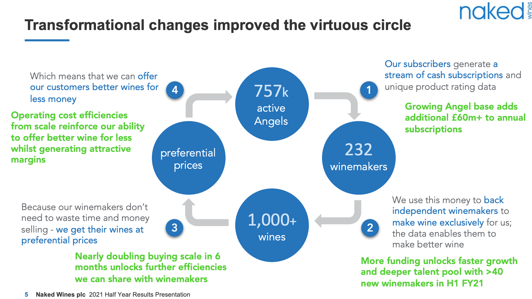 '천사'의 투자금은 와인 생산자에게 현금을 선지급됩니다. 이는 더 많은 와인 생산자가 네이키드 와인에 결합하는 동기가 되고, '천자'에게 '독점적으로(exclusively)'으로 공급되는 특정 와인의 수는 증가합니다. 또한 성장하는 천사 및 구독자의 수는 와인 생산자에게 예측 가능성을 부여하여 규모의 경제 효과를 구현하는데 도움을 줍니다.