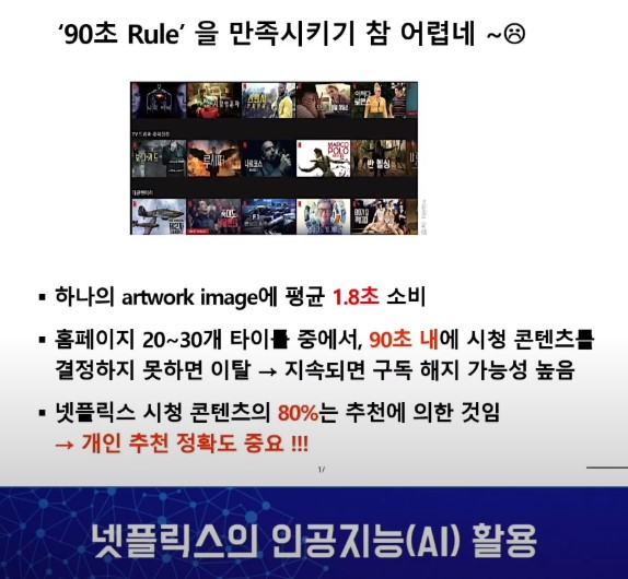 ‘90초 룰’은 이용자가 넷플릭스 홈페이지에서 어떤 작품을 볼 것인지 고를 때 90초 내에 시청할 콘텐츠를 결정하지 못하면 이탈할 확률이 높다는 걸 의미합니다. (아트워크 이미지라고 불리는 작품소개 이미지를 하나 보는데 평균적으로 1.8초 정도 걸린다고 함) 또한, 이렇게 이탈하는 경험이 몇차례 반복되면 구독을 해지하는 행동으로 이어진다고 합니다.