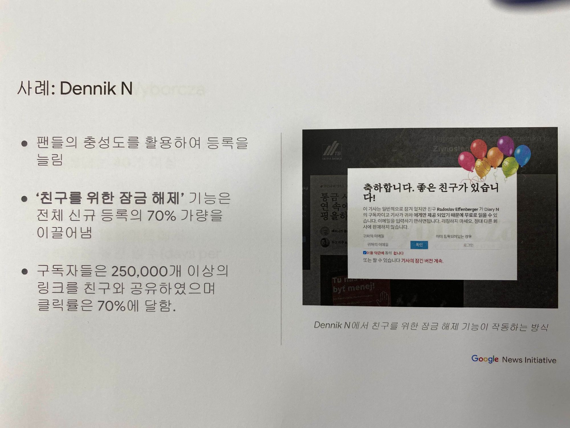위 이미지는 제가 GNI 디지털 성장 프로그램을 강연할 때 소개했던 사례 중 하나입니다. 슬로바키아 언론사인 Dennik N의 '선물하기' 기능과 효과에 대한 내용이었죠. 우리에겐 덜 친숙하지만 Dennik N은 페이월 기반으로 운영되는 전세계 언론사 중에서도 혁신 측면에서 단연 앞서 가는 곳 중 한 곳입니다. 어느 정도인지를 잠시 설명드리도록 하겠습니다.