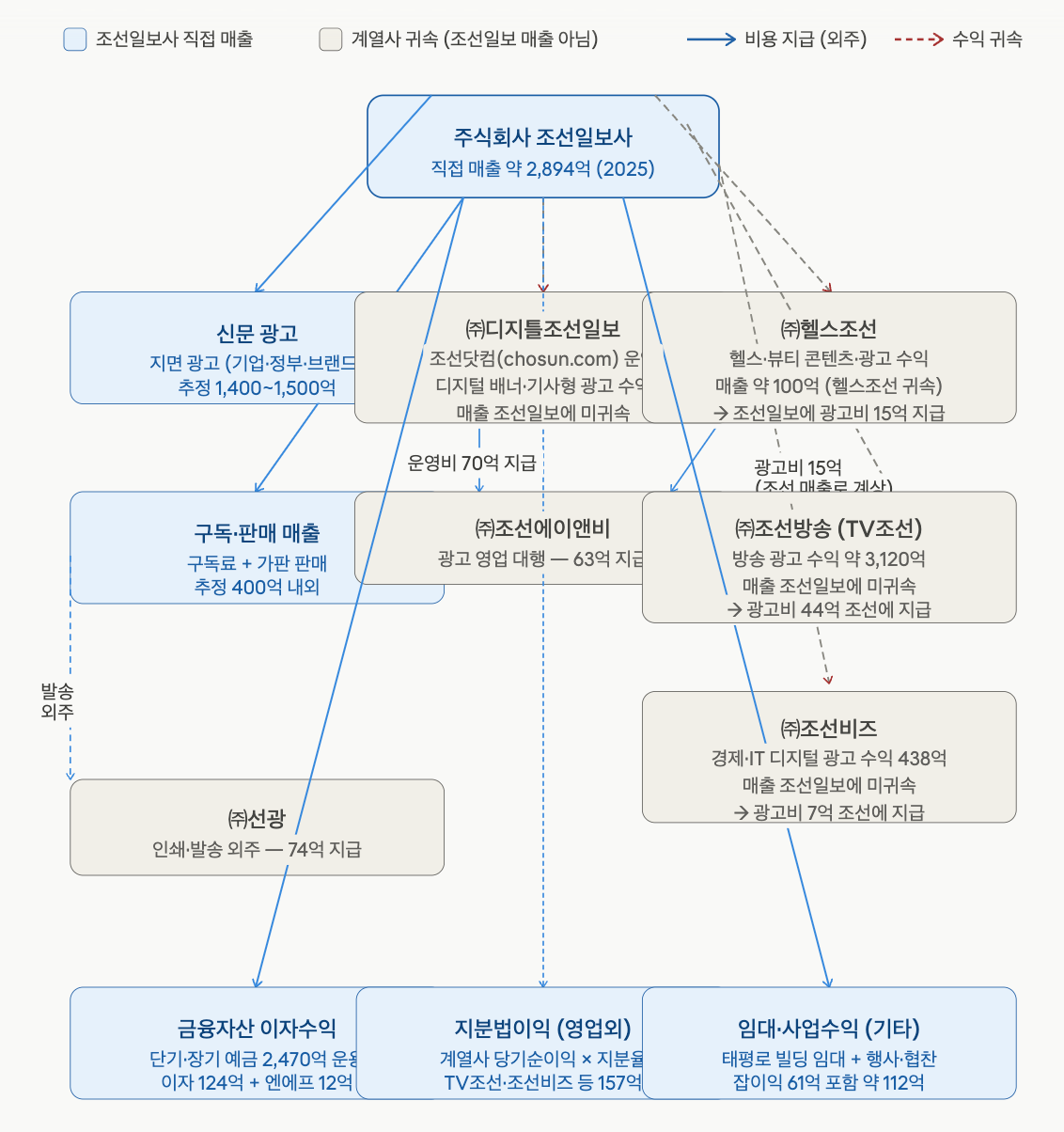 조선일보를 제대로 이해하기 위해서는 자회사와의 매출 관계도를 봐야 하는데요. 거칠지만 클로드의 도움을 얻어 아래와 같이 그려봤습니다. 예를 들면 더 쉬워지는데요. 조선일보는 종이신문 외에 조선닷컴을 운영하고 있죠. 조선닷컴에서 발생하는 디지털 광고 수익은 조선일보에 귀속되지 않습니다. 흥미롭게도 (주)디지털조선일보의 매출로 잡힙니다. 디지털 옥외광고 매출도 조선일보가 아닌 디지틀조선일보에 포함됩니다. 대신 디지틀조선일보는 조선일보에 브랜드 사용권에 대한 비용을 지불해야만 하죠. 쉽게 말해 조선닷컴에서 발생하는 광고 수익은 조선일보 게 아닌 셈입니다.