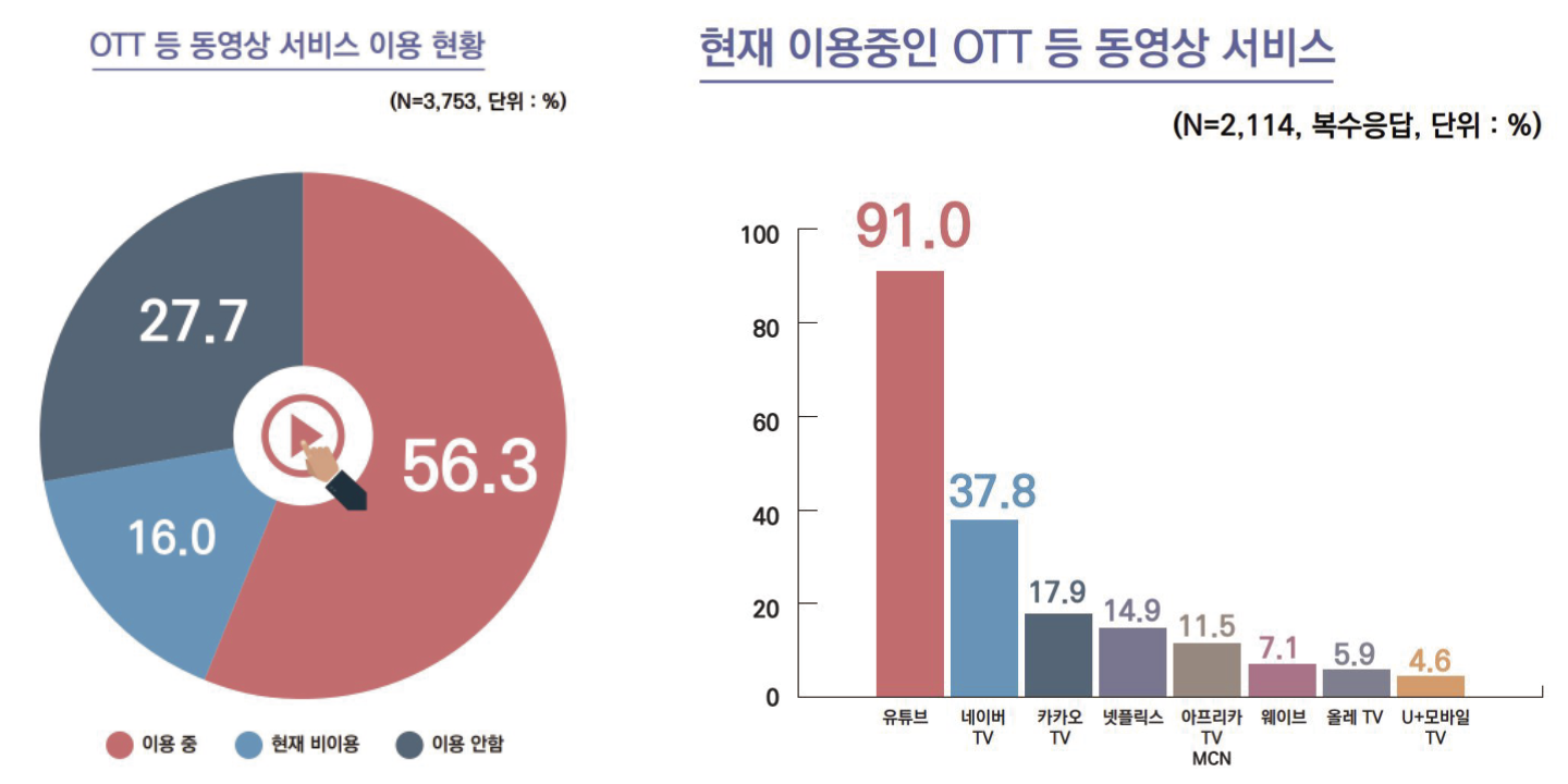 지난 5월 말, 정보통신정책원에서 발표한 ‘2019년 지능정보사회 이용자 패널조사 결과’에 따르면 스마트폰 이용자 절반 이상(56.3%) OTT 등 동영상서비스를 이용하고, 하루 평균 이용시간은 주중 56분, 주말 64분으로 나타났다. 현재 이용중인 서비스로는 유튜브가 91.1%로 압도적인 사용량을 보였다.