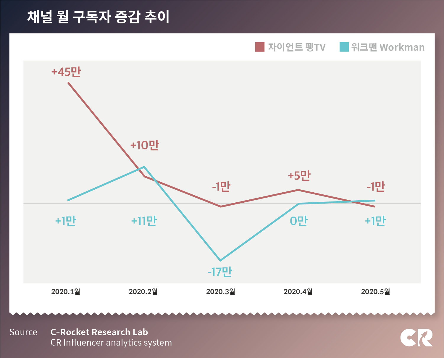 반면 ‘워크맨-Workman’은 3월에 논란 이후에도 매주 금요일마다 콘텐츠를 꾸준히 업로드했다. 3월에는 구독자 17만명이 이탈하였고 월 조회수도 점차 하향하며 하락폭이 커지는 중이다.