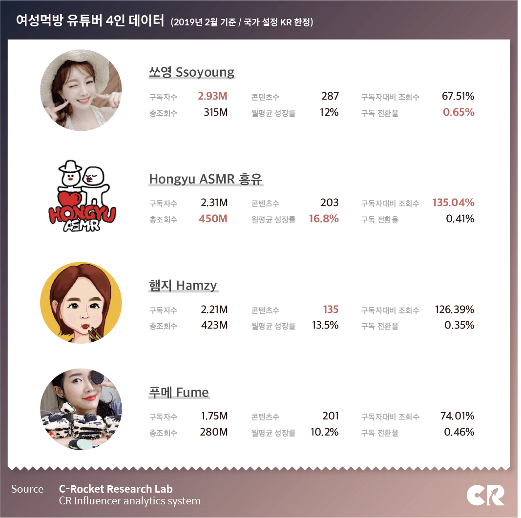 쏘영과 홍유, 햄지, 푸메 등 여성 먹방 유튜버 4인방의 상승세가 대단하다. 지난해 10월, 쏘영과 홍유가 구독자 1백10만명 안팎의 규모로 상위권(230위대)에 처음 진입한 이래 매달 수십만명의 구독자를 늘여가며 순위도 계속 올라가고 있다. 그리고 햄지가 11월, 푸메가 12월에 상위권으로 합류하며 4인방 체제가 형성됐다. (비슷한 규모로 성장한 여성먹방 유튜버 ‘쯔양’도 있는데 쯔양은 국가 표기를 한국으로 하지 않고 비워 둬 산정되지 않음)