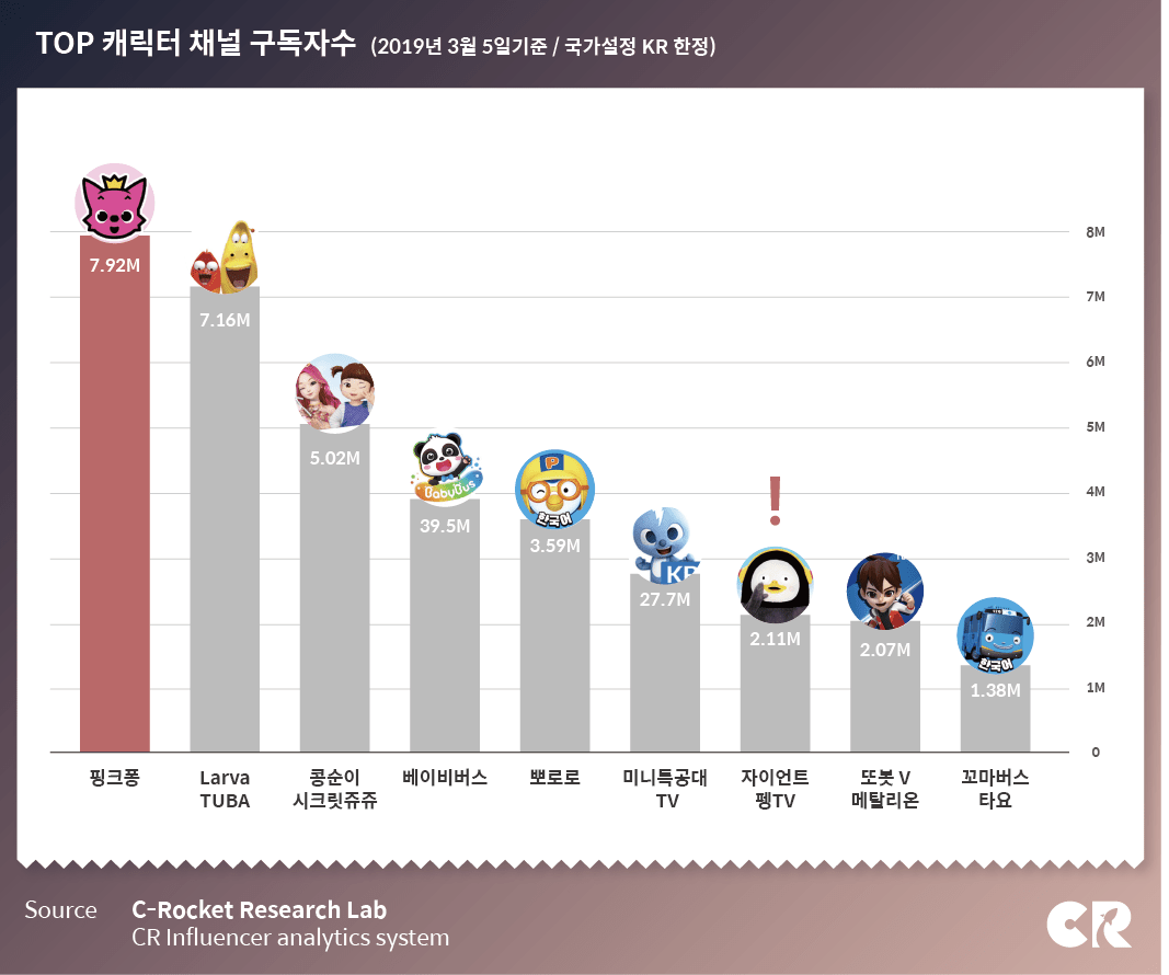 하나의 좋은 캐릭터가 열 명의 영업사원을 뛰어넘는다는 말이 있다. 인기를 증명하듯 세제, 체크카드, 편의점 등 일상으로 깊이 들어와 캐릭터시장이 점점 더 커지고 있음을 방증한다. 통계청과 한국콘텐츠진흥원에 따르면 2019년 상반기 콘텐츠산업 중 캐릭터 산업 매출액은 전반기 대비 0.1% 증가했고, 전년 대비 0.7% 증감했다. 대중에게 사랑받는 캐릭터가 어떻게 구독자들과 소통하고 자신의 채널을 만들어가는지 유튜브에서도 계속 지켜볼 필요가 있겠다.
