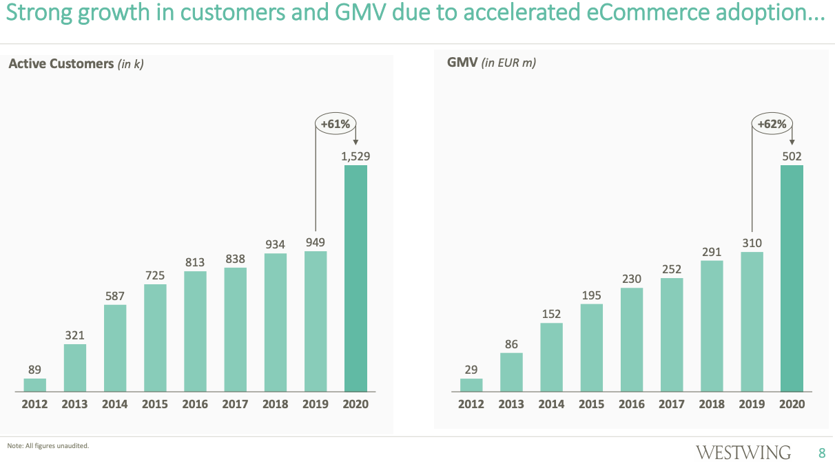 웨스트윙 또한 코로나 상황에서 급성장한 기업에 해당됩니다. 2019년 대비 2020년 이용자는 61% 증가, GMV는 62% 증가했습니다.