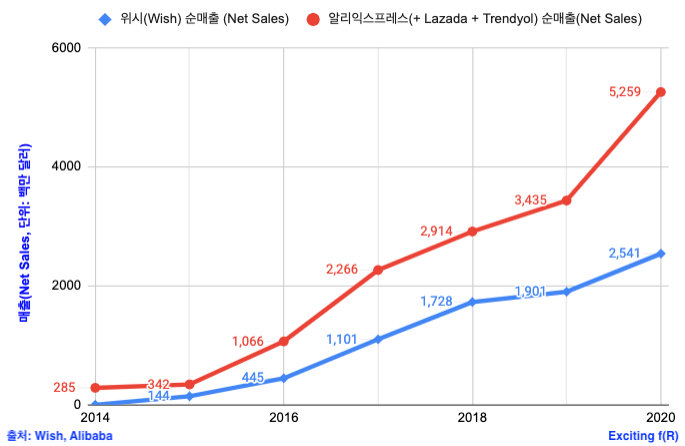 알리익스프레스의 경우 2020년 약 53억 달러의 순매출을 기록했고, 위시는 25억 달러 수준입니다. 약 두 배 차이가 납니다.