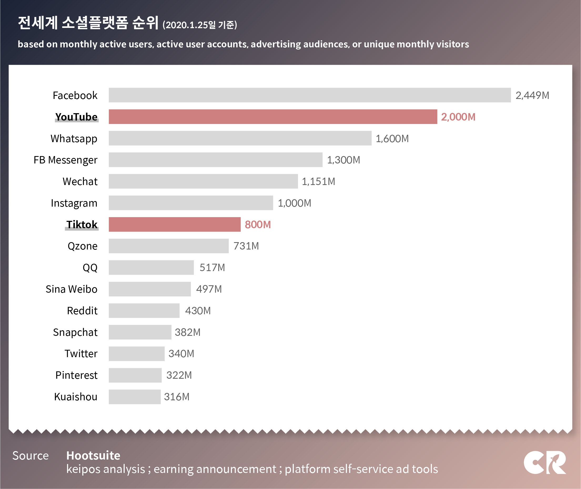 위의 그림처럼 전세계 소셜 플랫폼의 순위를 살펴보면, 올해 1월 현재 유튜브와 틱톡은 제법 차이가 큽니다. 월간 활성 이용자(MAU) 기준으로 20억명에 달하는 유튜브에 비해 8억명 수준인 틱톡은 절반에도 못 미치고 있습니다.
