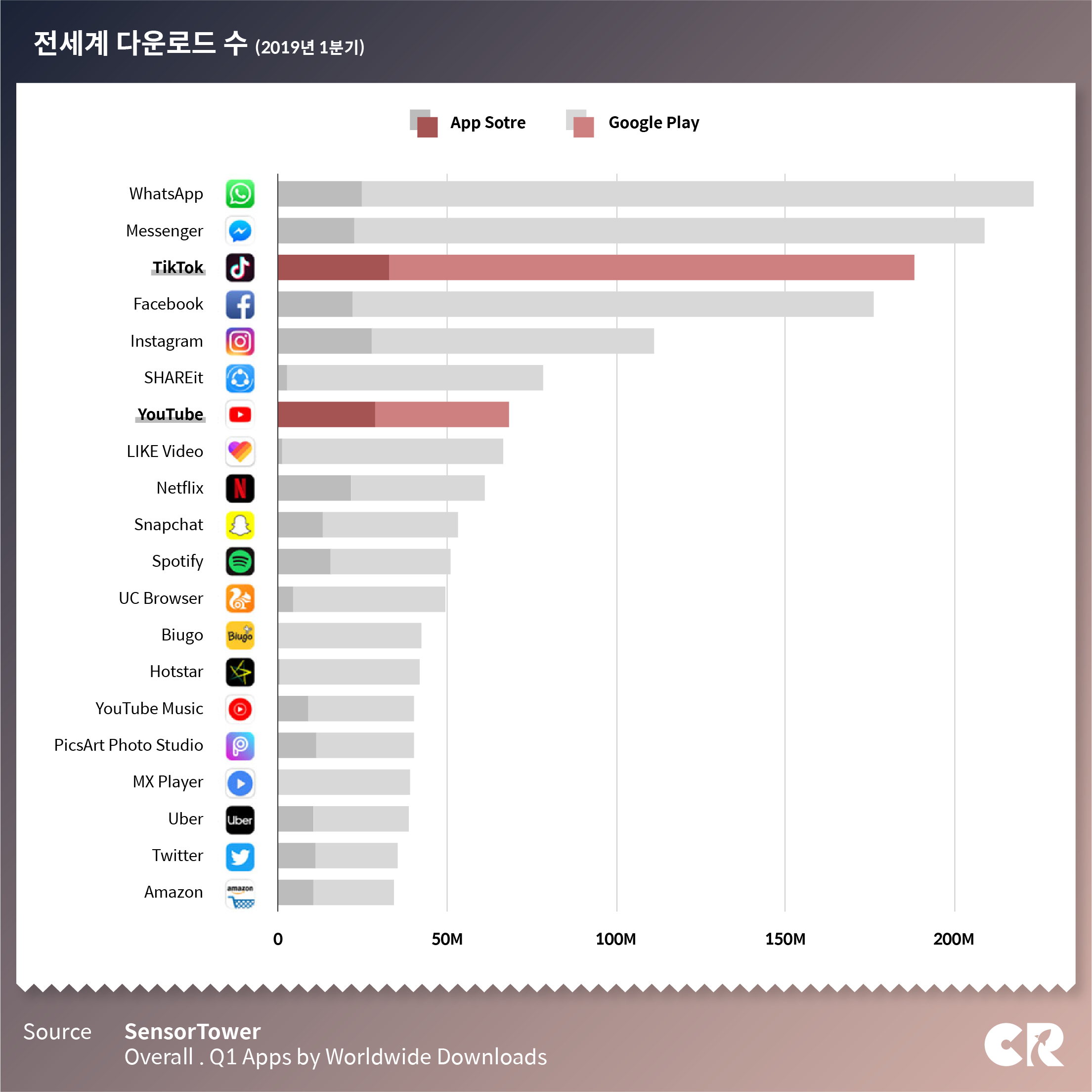2019년(1분기) 앱스토어와 구글플레이를 통한 전세계 다운로드 수를 비교해 보면 상반기 다운로드 수를 비교해 보면, 그림과 같이 틱톡이 2억 다운로드를 기록하며 유튜브를 2배 이상 앞지르고 있습니다.